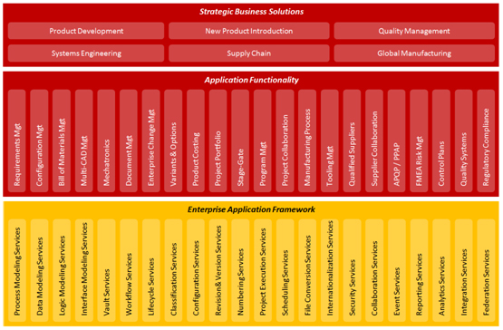 Figure 2 illustrates the range of solution models and business process models available out-of-the-box with Aras Innovator. The models can be modified, combined, and extended using the graphical model editor and simple forms. The solution models in turn subscribe to web services found in the Enterprise Application Framework (EAF) layer. When upgrades occur to the web services programs, these programs are replaced without impacting the XML models residing at the higher level, and since there is no implementation-specific business logic in Aras Innovator’s web services programs, all business logic is made available and is endlessly customizable within the modeling environment; upgrades do not require code changes to the solution models.