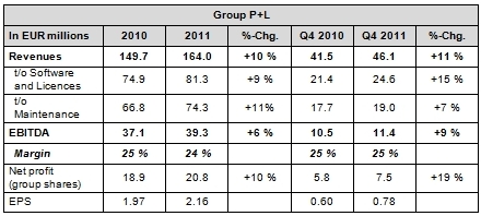 Nemetschek AG published its annual report today. As reported on publication of the provisional figures, the group was able to increase revenues by 10 percent in 2011 to 164 million euros (previous year 149.7 million euros).