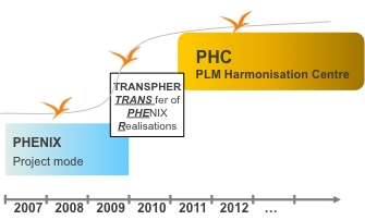 From the very early stages, the PHENIX programme was built to be a comprehensive and efficient cross-divisional organisation. Managed by Mr Jean-Yves Mondon, the PHENIX programme has, in its short history, already delivered on many of the programme’s original goals and objectives. In this role, Mr Mondon reports to EADS’ CTO, Mr Jean Botti, a member of the EADS Executive Committee. The programme was sponsored by the EADS CEO, Mr Louis Gallois. Mr Mondon and the EADS PHENIX Team have put in place a sustainable organisational structure and methodology that provides the framework and guidelines for the PHENIX programme. To date, the PHENIX programme has successfully implemented key processes and technology changes and has already achieved several of EADS’ strategic business objectives focused on federating the needs of their various divisions. The objective was to create a new PLM paradigm appropriate for all future and on-going civil, military, and space group product development programmes. The organisation has not been static—it has been allowed to evolve since its inception into a permanent networked structure called the PLM Harmonisation Centre (PHC), which superseded the PHENIX Programme. The timeline is reflected in following figure.
