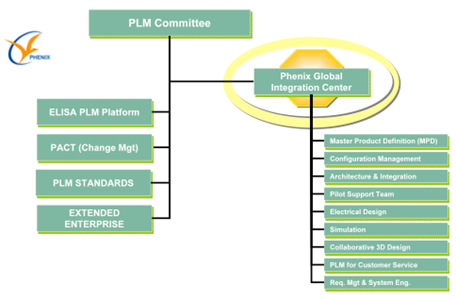 This PLM committee included representatives from each EADS division. The objective of this management body was to formulate a top-down strategy and to validate the different harmonisation deliverables coming from the individual projects and task forces. Reporting to the PLM Committee, the PHENIX Global Integration Centre (PGIC) was composed of a core team coordinating the different task forces in charge of cross-divisional projects.