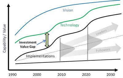 There can be a substantial gap in the value that PLM implementations using similar technologies delivered to different companies in the same industry. A CIMdata study revealed a widening gap between technology capability and actual implementations. This gap reduces the rate at which a company receives a return on their PLM investment. The following figure illustrates the gap that exists between the investment companies make in PLM technologies and the value they receive from the implementations that they deploy.